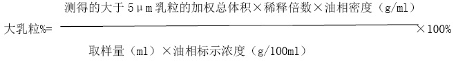 ??? 如果儀器配置有自動(dòng)稀釋系統(tǒng),直接用注射器或聚四氟乙烯管線將高濃度的樣品注入儀器中,由儀器自動(dòng)稀釋至適合的濃度再進(jìn)行檢測(cè);如果儀器不具備自動(dòng)稀釋功能,則需手動(dòng)稀釋(第一次至少稀釋10倍),在預(yù)先經(jīng)0.2mm孔徑過(guò)濾器過(guò)濾并經(jīng)超聲脫氣的水中加入適量的乳狀注射液,緩慢攪拌得到輕微混濁的均勻混懸液。無(wú)論哪種稀釋方式,最終粒子濃度均應(yīng)低于傳感器的重合限。將檢測(cè)器的閾值設(shè)為1.8mm,上限為50mm,測(cè)定樣品,每個(gè)樣品測(cè)定3次。儀器自動(dòng)計(jì)算出大于5mm乳粒的加權(quán)總體積,按下式計(jì)算其所占油相體積的百分比。